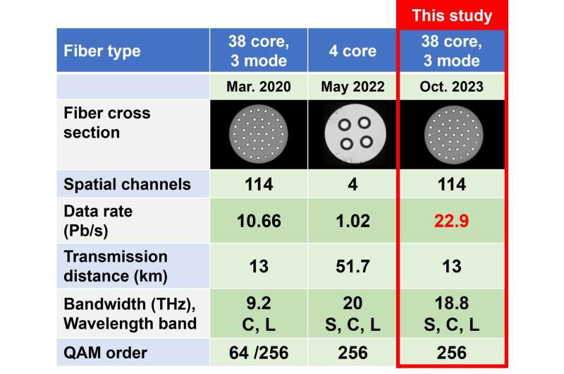 A research team from the National Institute of Information and Communications Technology (NICT) set a new world record for optical fiber transmission speed in November 2023, reaching 22.9 petabits per second (Pbps). This achievement was achieved by combining multi-band wavelength division multiplexing (WDM) and spatial division multiplexing (SDM) technologies. Specifically, they used multi-core, multi-mode fiber and multiple-input multiple-output (MIMO) receivers, resulting in a transmission capacity of 0.3 to 0.7 Pbps per fiber core and a total transmission capacity of 22.9 Pbps. This technological breakthrough lays the foundation for the realization of future ultra-large-capacity optical fiber communication networks​ (TechXlore)​.